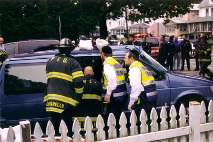 Hatzolah EMTs helping the Passaic Firefighters extricate one of the patients. (Note the police officers in the background)